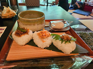J'ai une occasion en or de gouter du thé matcha, mais je me vautre lamentablement au moment de la commande et me retrouve avec un deuxième thé macha... Par contre c'est un délice, mais en boire 2 d'affilé c'est un peu too much. Les onigiris sont cool, mais le daifuku à la pêche c'est une tuerie.
