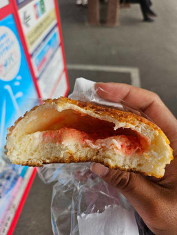 Je dois faire un changement pas loin de ma destination. J'ai pris ça pour le petit dej mais en fait c'etait salé. Etonnant. Au loin il y a un bâtiment fort étrange, c'est dans un cimetière.